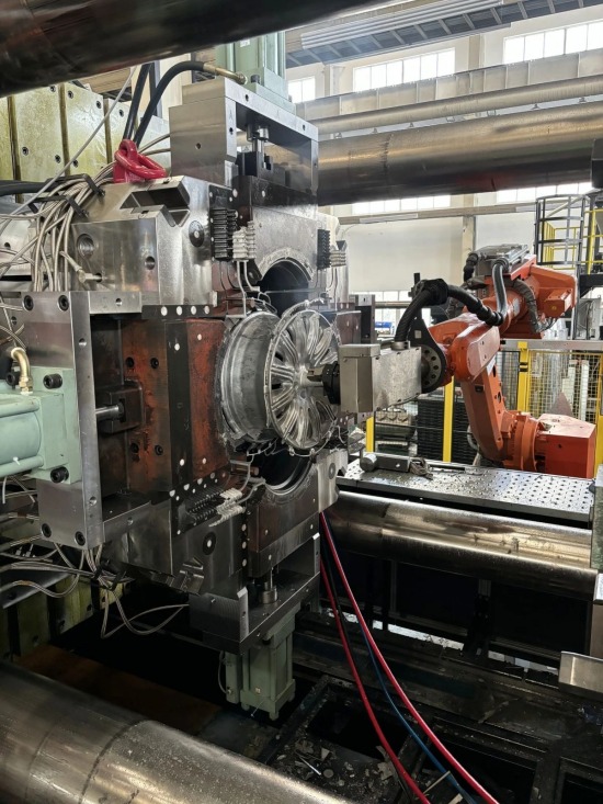 鑫林模具開發的鎂合金一體式后地板模具 在電驅系統領域,鑫林模具開發的鎂合金電機殼體模具突破性地達到與鋁合金同等氣密性標準(泄漏率≤0.5cm³/min)。通過真壓鑄工藝優化,鑄件內部孔隙率控制在 2%以內,首套樣品已搭載于某新能源汽車品牌暢銷車型。 工藝創新:半固態注射成型的突圍之路 半固態鎂合金注射成型是近年來興起并快速推廣的生產工藝。鑫林模具的半固態注射成型輪轂模具采用中心點進料技術,實現了三大突破:單腔注射量突破傳統 17.5kg 的上限,能夠滿足 20 寸以上大型輪轂的生產需求;在出品率方面革新,通過動態溫控系統,將材料利用率從 65%提升至 85%;在性能上躍升,輪轂抗拉強度大幅提升,超過了鋁合金的標準。