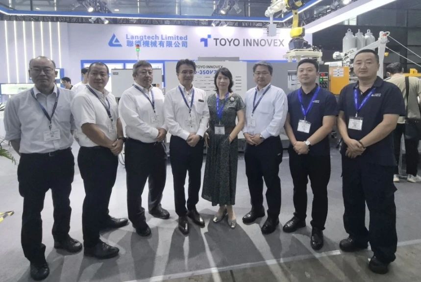 聯(lián)德機械、日本東洋TOYO管理層合影 TOYO INNOVEX株式會社 中國營業(yè)部部長代理 間鍋 宏樹(左1)、中國營業(yè)部部長代理 岡本 卓磨(左2)、執(zhí)行役員兼中國營業(yè)部部長 牧 卓矢(左4)、董事兼本部營業(yè)部部長 山本 博之(右3),東曜機械貿(mào)易(上海)有限公司副總經(jīng)理 松下 直哉(左3) ,與聯(lián)德機械集團聯(lián)朗(上海)機械有限公司總經(jīng)理駱妍嵐女士 (右4)、銷售總監(jiān)郭濤(右2)、技術(shù)經(jīng)理張慶泳(右1)