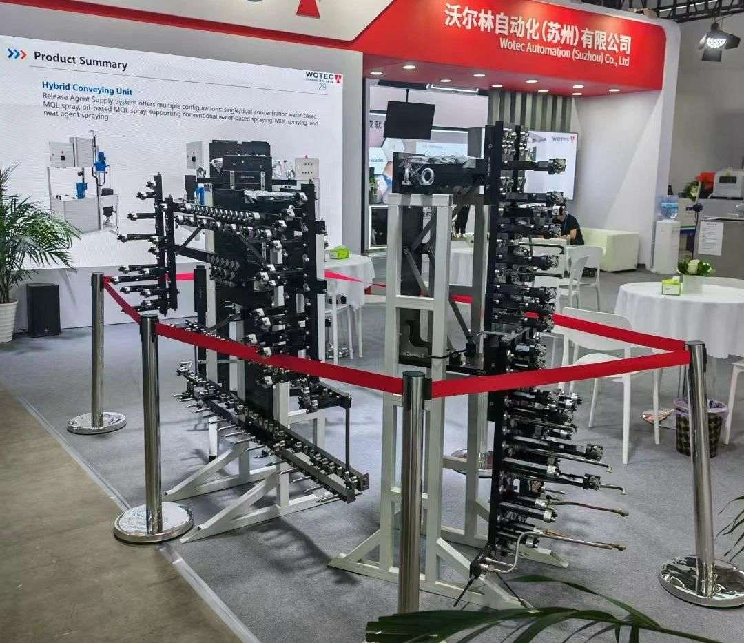 全自動伺服鋸床系統 系統底部配置接料斗與可移動廢料臺車,配合光電檢測功能,可自動提示渣包滿載狀態,便于及時清理,提升現場管理效率。該鋸床系統最大功率6.5KW,氣壓0.6MPa,夾持力4700N。 智能脫模劑供液系統:精準配比,穩定供給 為保障壓鑄生產中脫模劑的持續穩定供應,沃爾林自動化展示了其自主研發的脫模劑供液系統。系統配備不銹鋼儲存罐,混合液容量達200L。配比單元采用定量缸形式,實現1:1至1:300范圍內的無級調節,并通過PLC精確控制,確保配比一致性。 供液單元采用美國斯凱力Skylink氣動隔膜泵自動輸出混合液。攪拌單元利用氣動馬達攪拌,確保液體均勻混合、無沉淀。系統電源電壓要求220V/50Hz,空氣壓力要求0.3 - 0.6MPa,脫模劑供給輸出最大0.6MPa,能為生產提供穩定可靠的脫模劑供應。