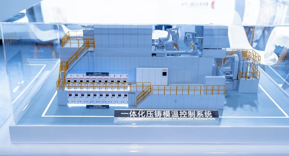 一體化壓鑄溫控控制系統(tǒng) 展會現(xiàn)場展示的一體化壓鑄溫控控制系統(tǒng)大模型,通過180℃壓鑄專用水溫機、320℃壓鑄專用油溫機、高壓點冷機等多系列溫控設(shè)備的集中控制與協(xié)同,成功攻克了從6000噸直至全球最大16000噸級巨型壓鑄模具的溫度均勻性平衡與毫厘級精準控制這一行業(yè)痛點,有力推動了大型結(jié)構(gòu)件一體化壓鑄的發(fā)展進程。 值得一提的是,此次展會中,奧德高端裝備緊扣鎂合金半固態(tài)成型工藝熱點,著重展示了該成型工藝下的模溫控制技術(shù)方案。由于鎂金屬活性高的特性,鎂合金易燃易爆,因此在成型過程中溫度控制格外嚴苛,以保障持續(xù)、穩(wěn)定的模具溫度,實現(xiàn)高安全性、高成品率的半固態(tài)注射成型生產(chǎn)。 據(jù)介紹,奧德高端裝備在鎂合金半固態(tài)溫控設(shè)備領(lǐng)域已有多年的技術(shù)積累和成熟的工藝方案,已為諸如寶武鎂業(yè)等鎂合金龍頭企業(yè)提供模溫控制設(shè)備。針對這方面的溫控設(shè)備,奧德高端裝備可以為用戶提供涵蓋鎂合金專用模溫機、油冷式的點冷機、低溫油冷式的冷卻站(模冷系統(tǒng))等的全套溫控單元。