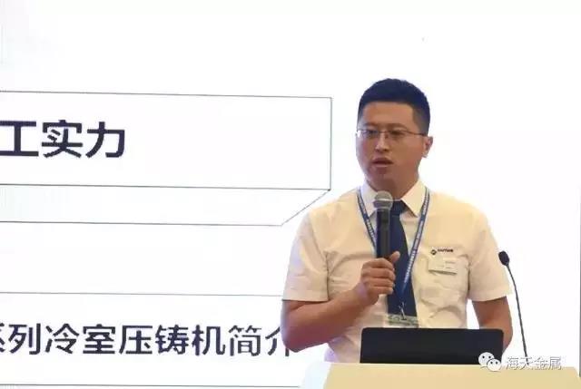 三天來,海天金屬展臺賓客盈門 海天壓鑄機 現場發布 展會首日,海天金屬還應邀參加了主辦方舉辦的“創新產品及技術發布會”。華南區域經理張鴻鵬先生在位于W4N87的會議區,現場發布了海天金屬HDC系列冷室壓鑄機,并重點介紹了該系列冷室機的合模機構。據張鴻鵬先生介紹,HDC系列鎖模機構開合模速度快,運動沖擊小,運動重復精度高,抗沖擊、耐磨性好,哥林柱承受拉應力小,剪切應力釋放充分,可靠耐用,使用壽命長。