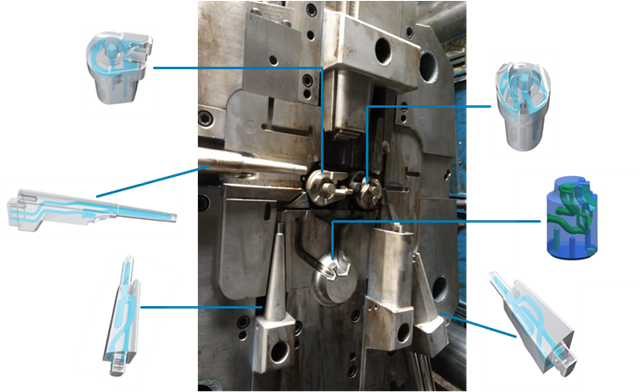 激光打印技術-增材制造在冷室機上的應用 FLM在冷室機的應用,隨形加熱與冷卻管在泵外殼模具上的設計,管道設計包括滑塊,型芯及鐵砧。減少冷卻時間約60%,從12秒減少到5秒,極大地減少了氣孔和縮孔,看不到氣孔和縮孔。