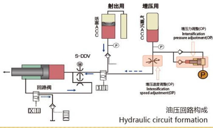 宇部UB-iC/iS2壓射系統示意圖 宇部壓鑄機優化了進口節流和出口節流回路,進口節流提供等量的負載壓力,出口節流由于背壓力,可起到阻尼作用,平穩性好。具有無沖擊啟動、無壓力波動、壓射穩定、速度控制性能良好、增壓時間更快速等優點,最大程度減少空氣卷入鋁液中。 宇部壓鑄機具有實時控制功能(全閉環控制),對壓射過程中低速、高速全程當模次的實時反饋+控制,具有低速段勻加速慢壓射、高速段壓射速度不會隨壓力波動而變化、剎車后速度穩定無波動等優點,壓射時隨設定參數及時修正,保證了壓射的重復精度。 S-DDV伺服閥是具有宇部專利技術的核心部件,宇部壓鑄機裝配了S-DDV伺服閥。相對于一般伺服閥,S-DDV伺服閥具有抗污能力強,流量控制范圍廣的特點,噴嘴處最小尺寸為 0.2-0.4mm。通過壓射時隨設定參數及時修正的功能,保證了壓射的重復精度。