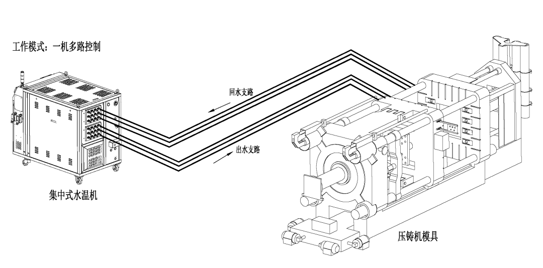 對模具水路管道區域使用多路集中式水模溫機進行智能調溫控制、供應到模具各部位上,循環使用,有效減少水模溫機數量,降低能耗并縮小占地達到降低使用成本。實現對壓力、流量、溫度實時監控與控制。