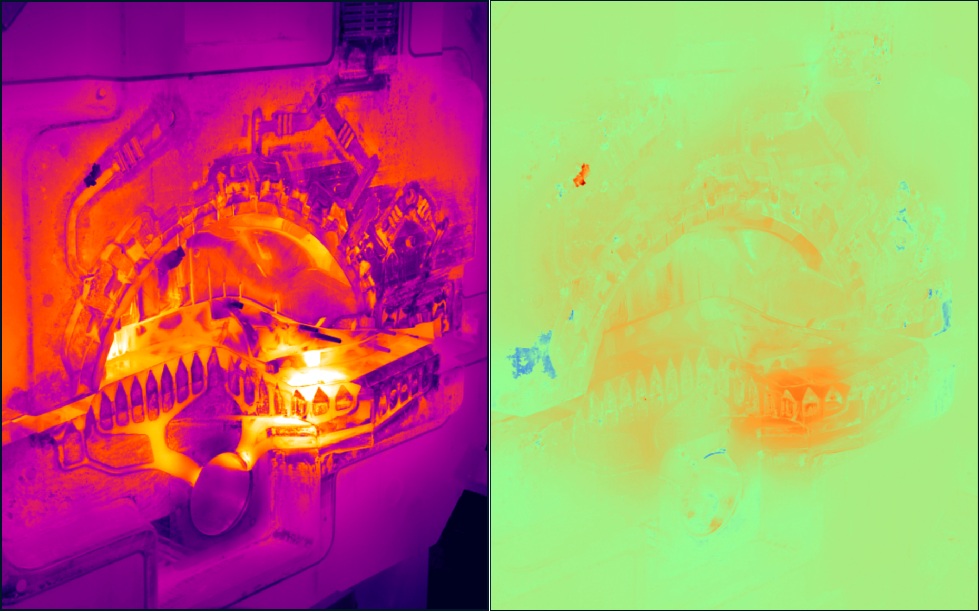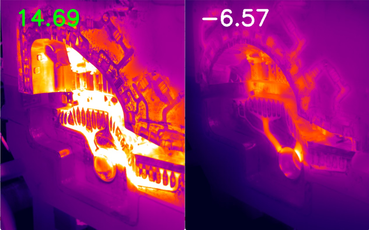 噴涂前 噴涂后 噴涂前后溫度差異 此外,在歷史數(shù)據(jù)查詢分析軟件中,用戶可以任意選擇兩張圖片進(jìn)行溫度對(duì)比。 二、模具位置精準(zhǔn)跟蹤功能。考慮到壓鑄車間惡劣的環(huán)境情況,換模觸碰相機(jī)、壓鑄過程振動(dòng)等原因可能導(dǎo)致紅外圖片中預(yù)先設(shè)定的溫度關(guān)注點(diǎn)位置發(fā)生偏移,從而影響模具測(cè)溫的穩(wěn)定性。為此,該系統(tǒng)新增了自動(dòng)識(shí)別并跟蹤模具位置的功能,確保測(cè)溫區(qū)域時(shí)刻準(zhǔn)確。此功能由系統(tǒng)自動(dòng)完成,用戶在無(wú)需進(jìn)行任何額外操作的同時(shí),也提升了系統(tǒng)的穩(wěn)定性和可靠性。