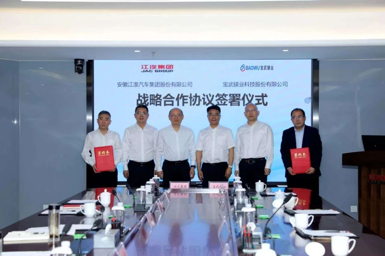 伯樂智能4000T鎂合金半固態注射成型機。圖源:伯樂智能 伯樂智能在鎂合金半固態注射成型技術領域處于全球領先地位。其自主研發的4000T超大型鎂合金半固態注射成型機,采用創新的半固態觸變注射工藝,有效解決了傳統壓鑄工藝中材料利用率低、能耗高、缺陷率高等問題。鴻泰元和鎂業近年來積極布局鎂合金深加工領域,目前已建成5萬噸/年鎂合金壓鑄生產線,產品廣泛應用于汽車輪轂、自行車輪轂及安全帽等終端領域。此次采購伯樂智能的半固態注射成型機,將助力鴻泰元和鎂業突破鎂合金大型一體化成型技術瓶頸,推動產品向高附加值領域拓展。 寶武鎂業與江汽集團深化戰略合作 來自寶武鎂業的消息,5月23日,寶武鎂業訪問安徽江淮汽車集團股份有限公司(簡稱“江汽集團”),雙方開展深入合作交流,并正式簽署戰略合作協議。未來將以聯合實驗室為紐帶,加速鎂合金材料在汽車領域的產研用融合,推動汽車行業向輕量化、低碳化方向發展。