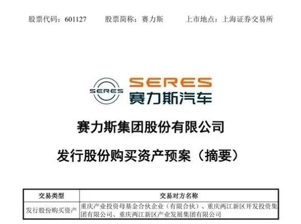 全賽力斯擬引入重慶國(guó)資,全資收購(gòu)AITO問(wèn)界工廠(chǎng)服務(wù)商 賽力斯近日發(fā)布公告,其擬發(fā)行股份購(gòu)買(mǎi)重慶產(chǎn)業(yè)投資母基金合伙企業(yè)(有限合伙)、重慶兩江新區(qū)開(kāi)發(fā)投資集團(tuán)有限公司、重慶兩江新區(qū)產(chǎn)業(yè)發(fā)展集團(tuán)有限公司持有的重慶兩江新區(qū)龍盛新能源科技有限責(zé)任公司100%的股權(quán)。