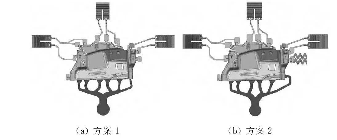 圖3 2種方案充型速度模擬結果 可以看出,方案1的溫度分布很不均勻,靠近鑄件中間區域有很大面積的溫度較低,不超過630℃,而其他區域的溫度都達到645℃以上,形成了較大的溫度差,使得該區域在凝固過程中的速度不一致,有明顯的凝固時間差,導致后凝固的區域得不到金屬液補縮。易出現嚴重的縮孔缺陷。方案2的溫度分布較為均勻,鑄件的主體位置溫差不超過3℃。就填充溫度來看,方案2優于方案1。當填充至40%時,方案1中A位置的填充速度過快,達到50m/s以上,使得速度較快的金屬液會優先填充鑄件,導致鑄件填充不均勻。當填充至73%時,因為A區域的金屬液填充過快,使得在與速度較慢的金屬液混合時會形成未填充的空白區域,見圖3c中B區域。該區域由于被兩股金屬液包圍而后才慢慢被填充,導致該區域容易出現憋氣現象。當填充至90%時,出現了大片容易憋氣的區域,見圖3e中C區域。相較于方案1,方案2的充型速度模擬效果更好。
