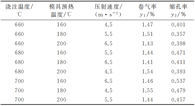 表3 田口正交表及結果統計 對于卷氣率、縮孔率這兩個響應目標而言,均符合田口試驗質量特性中的望小特性,故信噪比S/N的計算公式為: