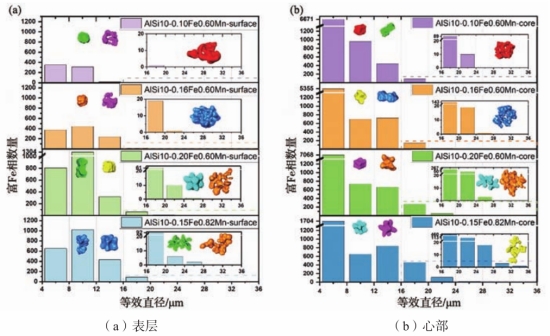 圖8 壓鑄AlSi10MgMn alloys 合金等效直徑超過10 μm的富Fe金屬間化合物 基于富Fe金屬間化合物的等效直徑對具有不同錳和Fe含量的合金表層及心部金屬間化合物進行了定量分析,如圖9所示。此外,還提取了不同等效直徑金屬間化合物的三維形貌。由圖可知,對于所有合金而言,心部的金屬間化合物數量遠多于表層。各合金中的金屬間化物特征如下。
