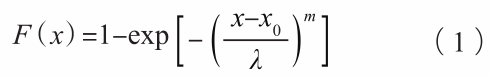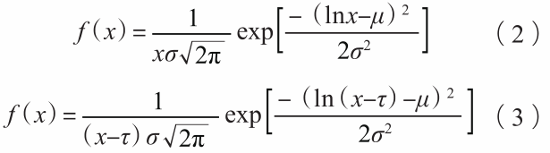 式中:λ是尺度參數,m是形狀參數,x是變量(此處為每個孔洞的體積),x0是位置參數(最小氣孔體積)。2參數Lognormal分布和3參數Lognormal分布的概率密度函數如下: