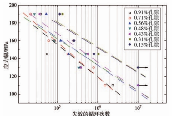 表4 壓鑄AlSi9Cu3合金的疲勞失效情況 在不同應用載荷鑄件的結構設計中,壓鑄鋁合金應力與疲勞壽命之間的關系(即S-N曲線)至關重要。作者利用X射線斷層掃描技術對ADC12壓鑄件48個疲勞試樣中的孔洞進行了表征,分辨率為5 μm。根據試樣中的孔隙率,將它們分為7組,平均孔隙率分別為0.91%、0.71%、0.56%、0.48%、0.43%、0.31%和0.15%。每組在5級應力水平下進行疲勞試驗,繪制了各孔隙率的S-N曲線如圖17所示。結果發現,對于孔隙率相差不超過1%的ADC12壓鑄件,其疲勞壽命相差一個數量級。同時歸納了ADC12壓鑄件孔洞尺寸-疲勞壽命預測公式: