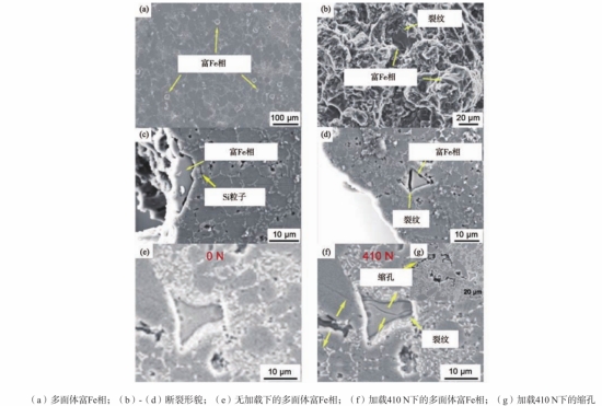 圖17 ADC12壓鑄件不同孔隙率的疲勞S-N線圖 3.2 富Fe相對力學行為的影響 在鑄造鋁合金中,Fe作為雜質元素,其形成主要的金屬間化合物會對合金的力學性能產生不利影響。因此,富Fe金屬間化合物對合金性能的作用已成為眾多研究人員重點關注的對象。為了減輕Fe元素在鑄造鋁合金鑄件中造成的損害,通常會通過添加錳和鉻等元素或者提高冷卻速率的方法來促進生成致密的α-Fe相。研究結果表明,高含量的錳和鉻能夠促進α-AlFeSi相的形成,抑制β-AlFeSi相的形核,進而改善AlSi7和AlSiCu合金的力學性能。由于壓鑄鋁合金作為結構件使用時對其力學性能有著較高要求, 作者利用原位SEM研究了合金鑄態和T6熱處理壓鑄AlSi10MgMn試樣的拉伸行為。在鑄態鑄件中,尺寸較小的α-Fe金屬間化合物上發現了微裂紋,但主裂紋主要通過共晶區擴展。經過T6熱處理后,由于固溶和時效處理過程中殘余應力的釋放,只有較大的金屬間化合物發生斷裂形成微裂紋。在拉伸過程中,因基體和硅顆粒變形量不同,兩者界面處形成了微孔,主裂紋通過連接這些微孔進行擴展。綜合上述研究可以看出,富Fe金屬間化合物對壓鑄鋁合金的力學性能有著極為顯著的影響。 在壓鑄AlSi合金富Fe相的研究中,Jiao和Xiong等人進一步地研究了富Fe金屬間化合物對合金力學性能的影響。他們在斷口表面發現了多面體富Fe相,如圖18所示。通過對縮孔和硅顆粒以及斷口表面多面體富Fe相的應力強度因子進行對比分析,得出了一個重要結論:尺寸較大的多面體富Fe相具備較差的變形協調性,容易成為應力集中源,進而促進了微裂紋的形成與擴展。盡管該研究證實了富Fe金屬間化合物對力學性能存在影響,但仍有兩點局限性需要考慮。其一,在斷口表面觀察到的相尺寸和裂紋長度可能小于它們在空間中的實際尺寸,所以計算得到的應力強度因子可能被低估。其二,正如先前的研究所示,聚集的富Fe金屬間化合物對主裂紋的擴展有著更為重要的影響,而該研究僅選取了斷口表面的單個金屬間化合物而未能考慮相鄰金屬間化合物的影響。