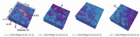 圖20 壁厚為5 mm的試樣中心區域的壓鑄試驗結果 由于不同的冷卻速度和凝固壓力,以及壓鑄過程中增壓壓力下的強制對流,壓鑄組織表現出了明顯的組織變化,即表層、偏析帶和心部。而Luo等人對晶粒形成的模擬范圍局限于1 mm³,難以捕捉壓鑄件微觀組織的復雜性和非均勻性。為了理解和揭示壓鑄鋁/鎂合金中微觀組織的形成過程及影響因素,需要進行考慮壓力傳遞、強制對流和溶質分布的超大尺度微觀結構演變模擬。此項工作不僅對于深入理解微觀組織的形成過程具有重要意義,同時對提升當前鑄造模擬軟件的功能也至關重要。通過該模擬,能夠更有效地預測微觀組織和性能,進而為優化實際壓鑄工藝提供有力支撐。結合X射線斷層掃描技術對微觀組織特征進行定量分析,可以驗證模型的有效性。需要注意的是,α-Al晶粒是影響鋁合金性能最重要的微觀結構之一。然而,對壓鑄鋁合金中晶粒三維特征的研究相對較少。這主要是因為X射線斷層掃描技術存在一定局限性,無法對密度相似的初生α-Al相和共晶Al相進行有效區分。此外,Q-Al5Cu2Mg8Si6和θ-Al2Cu都含有銅和鎂元素,且密度相近,也無法區分。因此,應結合其他先進的技術開展研究。本文作者利用納米尺度的連續切片掃描電子顯微鏡(SBFSEM)重構了微觀組織的三維特征,包括α-Al晶粒、Si顆粒以及尺寸為1~2 μm的α-Fe、β、Q和θ金屬間化合物,如圖21所示。因此,結合X射線斷層掃描技術和其他先進技術與超大尺度模擬進行研究,對于理解和控制壓鑄鋁/鎂合金的微觀組織特征至關重要。