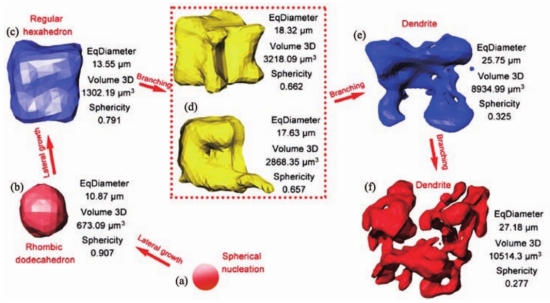 圖5 壓鑄亞共晶鋁-硅合金中富Fe相的分布和形貌分析 研究結果表明,初生富Fe相呈塊狀,而共晶富Fe相呈網狀,并參與三元共晶反應,沿著共晶邊界分布。沿柱狀拉伸試樣徑向選取了六面體、多面體和漢字狀的三種富Fe相,如圖5(b-g)所示。在含Fe和Mn元素鋁合金的平衡凝固過程中,通常會發生液相(L)→液相(L)+α/β-Fe的初生相轉變。然而,在高冷卻速率的非平衡凝固下,α-Fe相和α-Al相之間形成的溫度差異會減小,并且當冷卻速率達到100 K·min﹣¹時,這兩個相呈現出相同的形成溫度。因此,對于含有Fe和Mn元素的壓鑄AlSi合金而言,由于凝固過程中的高冷卻速率,初生相可能是α-Al相。對具有不同Fe和Mn含量的壓鑄AlSi10MgMn合金進行非平衡凝固分析可知,當Fe含量為0.15%時,如果Mn含量低于0.6%,初生相為α-Al相;相反,當Mn含量較高時,首先形成的則是α-Fe相。由于文獻所研究的壓鑄AlSi10MgMn合金中Fe含量不超過0.15%,Mn含量在0.5%-0.8%之間(遺憾的是實際Mn含量并未測量),因此,文中所提及的初生Fe相可能是在二元共晶轉變中形成的。進一步研究發現,采用較低的慢壓射速度有利于壓室中形成多面體富Fe相,并減少了鋁液中的Fe和Mn含量,導致型腔中形成的多面體和漢字狀富Fe相數量減少。 Jiao和Xiong進一步研究了壓鑄AlSi10MgMn合金中富Fe相的生長過程。如圖6所示,將兩種不同尺寸的初生富Fe相進行了分類,分別為壓室形成的初生富Fe相(P-IMC)Ⅰ和型腔內形成的初生富Fe相(P-IMC)Ⅱ。(P-IMC)Ⅰ的形狀近似六面體,而(P-IMC)Ⅱ近乎為球形,其特征包括體積、表面積以及圓整度等,列于表2用高分辨率透射電子顯微鏡(HRTEM)進行分析,(P-IMC)Ⅱ呈現出橫向生長,其密排面為{110}晶面,而壓室預結晶富集區的六面體(P-IMC)Ⅰ則沿著<100>方向生長成枝晶。通過不同體積的富Fe金屬間化合物推斷(P-IMC)Ⅰ的生長過程,如圖7所示。富Fe金屬間化合物形核后生長為多面體;隨著生長繼續,其與α-Al枝晶發生相互作用,最終形成內部中空的復雜枝晶形狀。