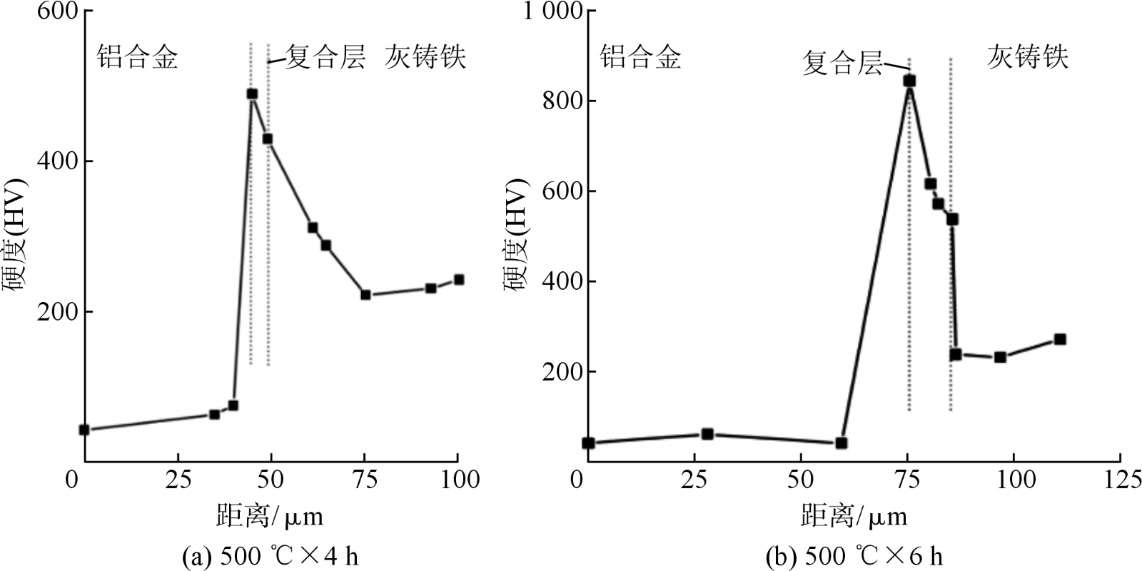 圖6 不同處理時間下雙金屬及復合界面結合層的顯微硬度