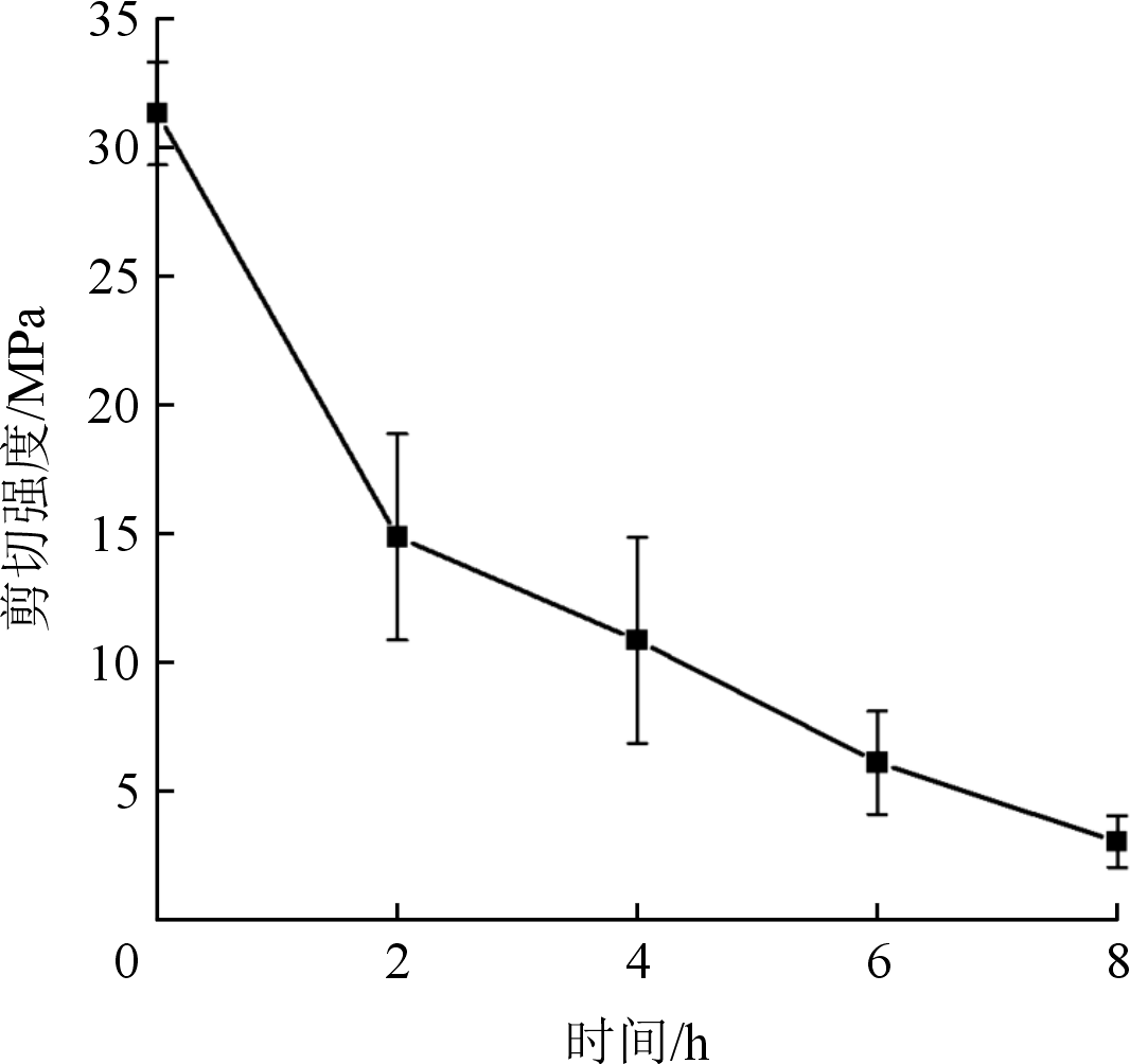 圖6為熱處理4 h和6 h后雙金屬復合界面厚度方向的顯微硬度變化曲線。可見鑄態下HT250嵌體的平均維氏硬度(HV)為227.295,A380基材的平均硬度(HV)為107.12。由于鑄態及熱處理2 h的雙金屬復合界面結合層厚度太薄,顯微硬度計壓頭無法精確下壓,因此無法有效測得界面結合層的顯微硬度。熱處理8 h的雙金屬復合試樣界面結合層已產生擴散微裂紋,也無法有效測得其顯微硬度。 圖7為不同熱處理時間下的雙金屬復合界面剪切強度變化曲線。可以看出,隨著熱處理時間延長,復合界面的剪切強度不斷減小,且降幅較大。在鑄態條件下,雙金屬復合界面的剪切強度最高,達到31.31 MPa。