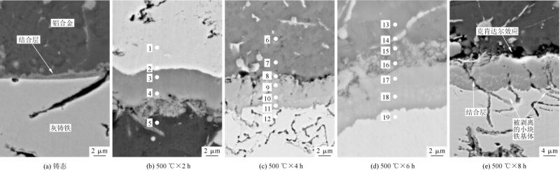 ![]() 原標題:湖北三環&武漢理工:熱處理對壓鑄鐵-鋁雙金屬復合材料界面組織及性能影響 現代工業對材料性能的要求日益提高,單一材料往往無法滿足產品的綜合性能需求。雙金屬復合材料將兩種具有不同化學和物理特性的金屬結合在一起,可以充分發揮并整合兩種金屬各自的特點,具備單一金屬難以實現的優勢,包括性能、成本和外觀等。為了確保兩種金屬之間結合牢固,通常要求雙金屬界面形成冶金結合層,即雙金屬間存在一定程度的擴散反應。對雙金屬復合材料進行熱處理能夠促進兩種金屬之間的原子擴散,改變界面結合層的厚度及微觀組織,從而影響雙金屬復合界面的性能。 鑒于不同金屬的熱處理工藝參數存在差異,通常難以讓雙金屬復合材料中的兩種金屬均達到理想的熱處理狀態,故選取適當的熱處理工藝參數對于復合界面的組織及性能意義重大。研究者對AM60-A390雙金屬構件在不同溫度下進行熱處理后發現,最優熱處理溫度為425 ℃,此溫度下雙金屬界面剪切強度提高了21.9%。對6101-A356雙金屬擠壓鑄造件進行了T6熱處理,兩種金屬界面的擴散層厚度由110 μm增加至170 μm,復合界面的剪切強度由76.7 MPa提升到102.7 MPa。對Al-Cu復合板采用不同熱處理,發現界面擴散層伴隨溫度的升高而逐漸變寬,復合板的剪切強度隨著退火溫度的升高先增大而后減小,在350 ℃時達到峰值。針對Al-Al復合鑄件在熱處理前后的鍍層金屬含量展開了研究,發現熱處理后,鍍層金屬能夠充分溶解與擴散,促使復合界面的力學性能得以增強。由此可見,熱處理對雙金屬界面結合層的組織以及力學性能具有較大影響。已有研究表明,在高壓鑄造冷速快、凝固時間短的條件下,Fe-Al雙金屬界面能夠形成冶金結合層,但厚度較薄,僅為1μm 。不同熱處理參數對基于高壓鑄造工藝制備的Fe-Al雙金屬復合鑄件界面組織及力學性能的影響規律尚不明確。 本研究通過對HT250-A380雙金屬復合鑄件進行熱處理,研究不同熱處理時間下雙金屬復合界面結合層厚度及微觀組織的變化,并通過雙金屬復合界面硬度、剪切強度等的測試,分析熱處理時間對雙金屬復合界面力學性能的影響,以期為雙金屬復合材料的制備與改性提供參考。 圖文結果 基于壓鑄工藝實現了鐵-鋁雙金屬的固液復合成形,其中固相嵌體材料為HT250灰鑄鐵,液態金屬為A380鋁合金成分分別見表1和表2。 采用宇部UB1650iV冷室壓鑄機制備HT250-A380雙金屬復合鑄件。壓鑄低速速度為0.2 m/s,高速速度為5 m/s,增壓壓力為80 MPa,A380鋁合金澆注溫度為650 ℃,金屬模具和灰鑄鐵嵌體預熱溫度均為200 ℃。為了實現雙金屬試樣復合界面的冶金結合,對灰鑄鐵固相嵌體表面進行電鍍鋅處理,以避免固體金屬表面氧化阻礙金屬間的擴散結合,并提高其潤濕性。固相嵌體經過噴砂、0.5 mol/L鹽酸和乙醇沖洗后,使用含有150 g/L的ZnSO4、50 g/L的N2H8SO4和15 g/L硼酸的電解液進行掛鍍鋅處理,電鍍溫度為室溫,掛鍍時間為1 h,鍍鋅層厚度約為8μm。 圖1為利用線切割截取的用于進行熱處理試驗雙金屬結合面試樣和剪切測試夾具。通常來說,熱處理溫度越高,原子擴散系數越大,越容易促進雙金屬界面層原子的擴散反應與結合。雙金屬鑄件中的鋁合金基體采用壓鑄工藝制備,過高的熱處理溫度會使A380鋁合金表面產生氣泡缺陷。保溫時間過短造成雙金屬界面擴散反應不充分,保溫時間過長會使母材晶粒長大,故設置5個對照組。1組為壓鑄態,不進行熱處理,其余4組的熱處理溫度均為500 ℃,保溫時間分別為2、4、6和8 h,爐冷。 表1 HT250灰鑄鐵的化學成分(%)