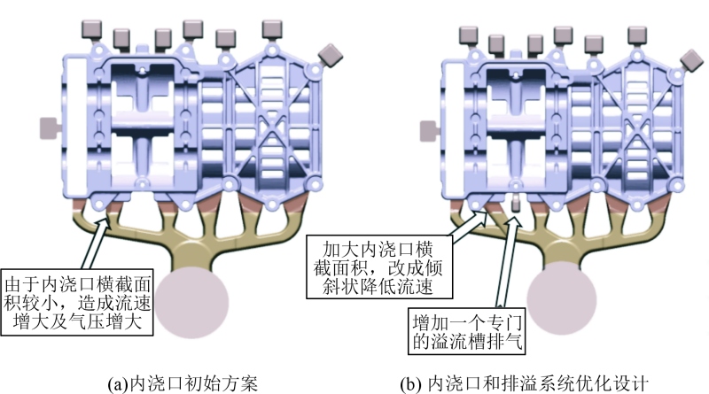 圖8 充型過程金屬液和模具溫度變化模擬圖 結論 (1)鋁合金連接支架零件區域差異化的壁厚形狀阻礙了鋁液充型時的速度和流量均衡,因此初始設計6個相等的內澆口容易造成各部位凝固速度差別較大,鋁液交匯處有裹氣和冷隔缺陷。 (2)針對支架鑄件各區域的不同的壁厚和結構,設計差異化的內澆口,改變鑄件局部的充型流量與充型壓力關系,同時在內澆口增加溢流槽,能夠提高排氣效果及改善填充凝固質量。 (3)通過充型壓力模擬對比結果和P-Q2關系曲線圖表,證明優化方案能改善鑄件包氣和縮松等缺陷。 《鋁合金連接支架壓鑄數值模擬及工藝優化》