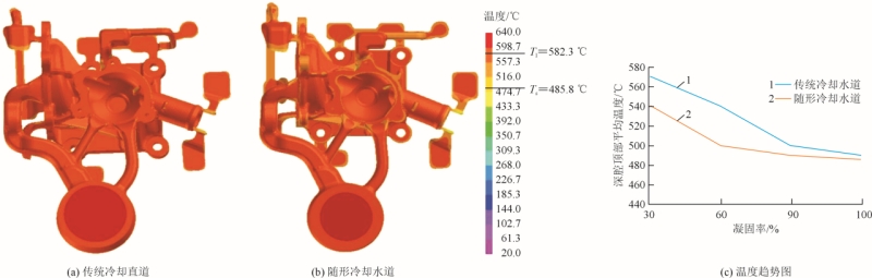 圖8 活塞運(yùn)動(dòng)速度與時(shí)間關(guān)系圖 用模流軟件中的void預(yù)測模型充型過程中易出現(xiàn)裹氣的部位,見圖9。可以看出,當(dāng)鑄件充型70%時(shí)最開始填充離內(nèi)澆口最近的碗形深腔頂部,而在充型80%的時(shí)候,深腔頂部和3個(gè)圓孔基本充滿,說明充滿深腔頂部的金屬液流速很快,這不利于內(nèi)部收縮甚至產(chǎn)生縮孔。鑄件充型90%時(shí),除溢流槽和一側(cè)邊圓孔外,鑄件內(nèi)部已經(jīng)充填完畢,而在充型95%時(shí),只有溢流槽部分未充滿,表明側(cè)邊單一圓孔金屬液填充速度過快,容易出現(xiàn)縮孔缺陷。圖10為兩種冷卻水道的鑄件凝固30%時(shí)溫度場及溫度趨勢。可見傳統(tǒng)冷卻水道的碗狀深腔溫度約為570℃,而帶有隨形冷卻水道效果更優(yōu),深腔邊緣溫度約為540℃,頂部為557℃,在型腔內(nèi)部能夠避免熱節(jié)處出現(xiàn)孤立液相區(qū)導(dǎo)致無法補(bǔ)縮的問題,進(jìn)而避免縮松縮孔缺陷的發(fā)生。 圖11為帶有傳統(tǒng)冷卻水道和隨形冷卻水道模具充型凝固完成后的溫度場,將其沿著XY、XZ方向切片,對(duì)比模具溫度變化。從沿著XZ切片圖可以看出,在深腔頂部左外表面上和深腔內(nèi)部溫度隨形水道的冷卻效果優(yōu)于傳統(tǒng)水道。隨形冷卻水道左表面溫度梯度由少部分溫度區(qū)間226.7~268℃轉(zhuǎn)變?yōu)榇蟛糠郑疑钋粌?nèi)部268.0~309.3℃的溫度呈降低趨勢。圖12為深腔最終凝固時(shí)間分布圖。