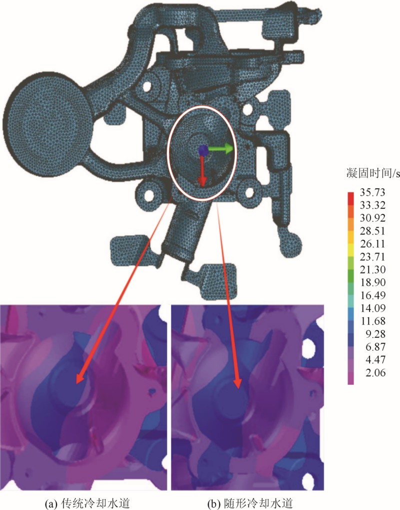圖6 增設(shè)隨形冷卻水道方案 首先用UG建立簡易的活塞、壓室和模具,將其連同冷卻水道(傳統(tǒng)冷卻直道和隨形冷卻水道)和水泵壓鑄件(水泵座+流道+料餅+溢流槽)一塊裝配,然后在模流軟件界面進(jìn)行面網(wǎng)格和體網(wǎng)格劃分。設(shè)置鑄件面網(wǎng)格尺寸為1mm,冷卻水道面網(wǎng)格尺寸為1.5mm,活塞、壓室和模具面網(wǎng)格尺寸為4mm。帶有傳統(tǒng)冷卻直道的有限元模型面網(wǎng)格數(shù)量為127076,體網(wǎng)格數(shù)量約為245萬,帶有隨形冷卻水道的有限元模型面網(wǎng)格數(shù)量為129052,體網(wǎng)格數(shù)量約為233萬。有限元模型見圖7。模擬的工藝參數(shù)包括澆注溫度為640℃,模具預(yù)熱溫度為240℃,活塞快壓射速度為3 m/s,慢壓射速度為0.3m/s,壓室高度為300 mm,可以得到快壓射時(shí)間為0.018s,慢壓射時(shí)間為0.818s。其活塞運(yùn)動(dòng)速度與時(shí)間曲線見圖8。