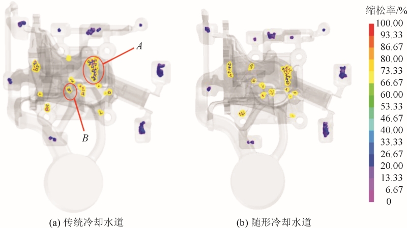 圖12 深腔最終凝固時(shí)間分布圖 圖13為傳統(tǒng)冷卻水道和隨形冷卻水道下鑄件縮松縮孔預(yù)測圖。可以看出,隨形冷卻水道下鑄件內(nèi)部質(zhì)量更好,在調(diào)整缺陷概率發(fā)生20%的情況下,溢流槽和底部矩形通孔端面都有縮孔缺陷發(fā)生,但在鑄件深腔內(nèi)的最后充型位置A、B處的局部縮松率存在著較大差異。傳統(tǒng)冷卻水道下的鑄件A處出現(xiàn)了縮松,體積為0.1746cm3,而隨形冷卻水道下的縮松體積下降到0.1356cm3;傳統(tǒng)冷卻下B處產(chǎn)生的0.0194cm3縮松體積在使用了隨形冷卻鑲塊后直接消除。 傳統(tǒng)冷卻水道下的鑄件縮松縮孔體積約為0.8436cm3,縮松縮孔發(fā)生平均概率約為25.57%。帶有隨形冷卻水道鑲塊的鑄件縮松縮孔體積約為0.7605cm3,減少了9.8%,縮松縮孔平均發(fā)生概率降低到24.92%。這是由于采用了隨形冷卻的鑄件能夠有效降低深腔頂部壁厚區(qū)域的溫度,使得鑄件與模具間溫差小,保證了金屬液流動(dòng)暢通,針對(duì)孤立液相區(qū)的補(bǔ)縮能力提高,進(jìn)而降低了縮松縮孔發(fā)生的可能性。