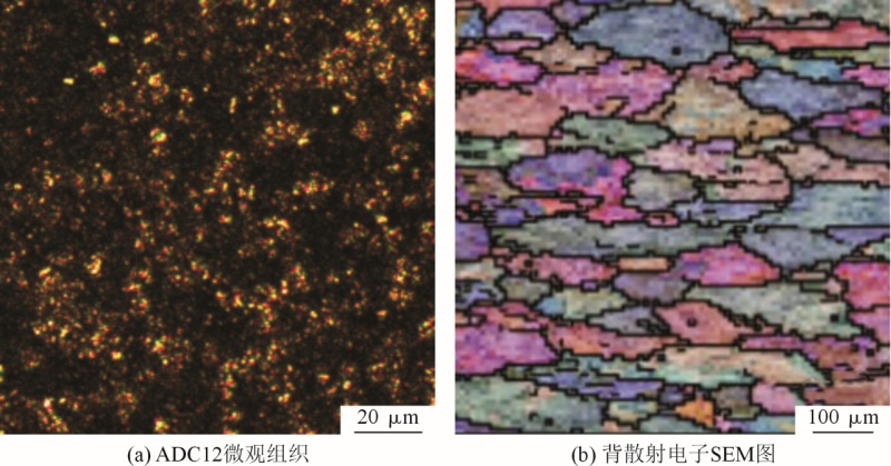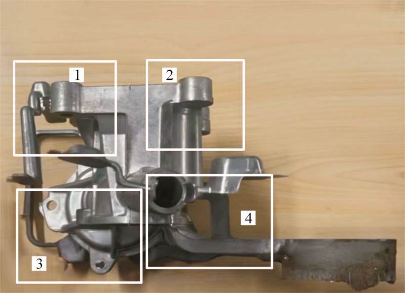 圖13 鑄件縮松縮孔預(yù)測圖 將模擬驗(yàn)證最優(yōu)冷卻方案的隨形冷卻鑲塊安裝到模具上,采用海天HDC400壓鑄機(jī)進(jìn)行實(shí)際生產(chǎn),后處理去除溢流槽后的鑄件見圖14。從外觀能夠初步判斷該鑄件具有較好的表面粗糙度,無明顯翹曲變形。對(duì)圖14水泵壓鑄件分成4個(gè)區(qū)域進(jìn)行X射線探傷,觀察鑄件內(nèi)部是否產(chǎn)生縮松縮孔缺陷,結(jié)果見圖15,可以看出鑄件內(nèi)部無缺陷。在水泵座深腔頂部取樣,見圖3a圓圈所示。線切割機(jī)切割并用XQ-1鑲嵌試樣,用300~1000目砂紙打磨后用拋光布和W1及W2.5金剛石研磨劑在金相試樣磨拋機(jī)上拋光,用體積分?jǐn)?shù)為0.5%的HF腐蝕,靜置3~5s后用無水乙醇清洗干凈并用吹風(fēng)機(jī)吹干。使用蔡司AxioVertA1光學(xué)顯微鏡觀察顯微組織。使用蔡司EVO18型掃描電鏡進(jìn)行SEM觀察。組織分析見圖16。