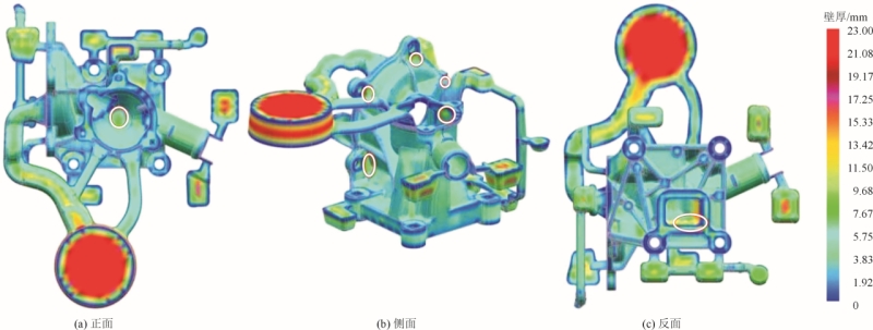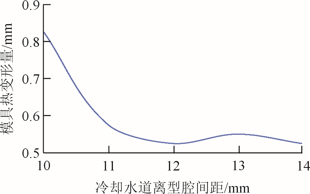 圖3 水泵壓鑄件三面壁厚 針對(duì)于碗形深腔頂部增加水道設(shè)計(jì),見圖4。該處連接著兩個(gè)內(nèi)澆口,是除了料餅之外,最早受到金屬液充型的地方。其頂部壁厚也是整個(gè)水泵座最厚的部位之一,需要在此處設(shè)計(jì)冷卻水道,避免鑄件表面的翹曲變形和內(nèi)部縮松縮孔缺陷的發(fā)生。設(shè)計(jì)水道直徑過大會(huì)使流速變慢,雷諾數(shù)降低,傳熱系數(shù)降低。過小會(huì)導(dǎo)致流速變快、冷卻水道間隔太小,導(dǎo)致散熱不好,進(jìn)而導(dǎo)致產(chǎn)品局部產(chǎn)生缺陷。 (1)傳統(tǒng)冷卻水道方案 采用直線型,通常是直接在模板和模芯中鉆孔得到,具有結(jié)構(gòu)簡單、加工成本低等特點(diǎn)。原有的冷卻系統(tǒng)就是針對(duì)水泵壓鑄件大壁厚部位布置的冷卻水道,共有6條直通水道。在原有傳統(tǒng)冷卻系統(tǒng)基礎(chǔ)上,根據(jù)深腔頂部中空的結(jié)構(gòu)特征,增設(shè)傳統(tǒng)冷卻直道(圖4中圓圈標(biāo)注)。 (2)隨形冷卻水道方案 由于深腔頂部的結(jié)構(gòu)復(fù)雜,傳統(tǒng)冷卻直道無法在內(nèi)腔進(jìn)行有效布局,進(jìn)而無法獲得均勻的溫度梯度,影響了鑄件品質(zhì)。為了解決這個(gè)問題,在模具水冷鑲塊內(nèi)腔增設(shè)隨形冷卻水道。冷卻水道的建模大致分為:確定冷卻水道的尺寸和傳熱系數(shù)、確定水道中心線和生成冷卻水道。 圖5為水道離型腔間距與模具熱變形量關(guān)系圖。可以看出,控制水道離型腔間距在11~13mm之間,模具熱變形量趨于極小值,能夠有效平衡熱梯度以及提高模具使用次數(shù)。