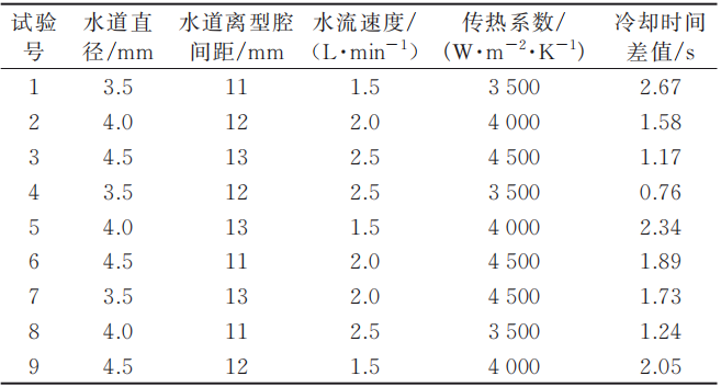 圖5 水道離型腔間距與模具熱變形量關(guān)系圖 為了統(tǒng)一冷卻水道相關(guān)工藝參數(shù),采用正交試驗(yàn)得到影響鑄件冷卻均勻性的參數(shù)(水道直徑、水道離型腔間距、水流速度和傳熱系數(shù))范圍優(yōu)化值。模擬采用傳統(tǒng)水道方案里的模型,因變量取最終凝固時(shí)深腔頂部兩點(diǎn)總冷卻時(shí)間差值,選擇望小特性,4因素3水平試驗(yàn)表見表2。得到的冷卻水道范圍優(yōu)化工藝參數(shù):水道直徑為3.5mm、水道離型腔間距為12mm、水流速度為2.5 L/min、傳熱系數(shù)為3500W/(m2·K)。 提取鑄件深腔凹模的邊緣線一定距離(h=8mm),充分考慮模具深腔頂部圓角處的應(yīng)力分布及傳熱效應(yīng),以凹模頂部圓角位置作為基點(diǎn),用離型腔距離確定其布置水道的中心點(diǎn);然后同確定好的水道直徑4.5mm畫圓,在類球殼界面上做螺旋式引導(dǎo),并與沿著頂部正中心及重力方向的輪廓線相連接,使其覆蓋深腔頂部型腔,見圖6。采用圓形的水道截面和緊貼內(nèi)腔形狀的多層螺旋型結(jié)構(gòu),可以達(dá)到接觸面均勻冷卻的效果。 表2 L9(34)正交試驗(yàn)表