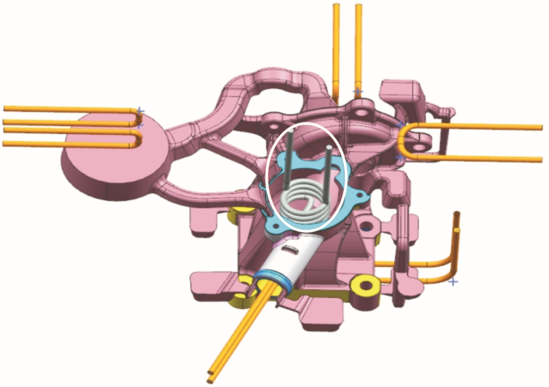 圖2 水泵壓鑄件三維模型及壓鑄模
