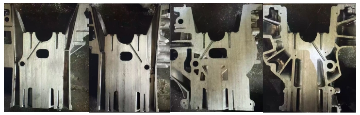 四、優化后的雙側進料的優勢及實際應用效果: 1.此種進料方式的優勢:首先解決了單側進料所存在的壓力傳遞及補縮通道小而導致的組織不均勻的問題,其次對常規雙側進料方式在填充梯度進行了優化,很大程度上解決了雙側進料排氣困難的問題;與此同時,很一定程度上提高了模具的適用壽命; 2.此種進料方式實際應用效果:通過對上述的優化,且結合相應適用此方式的壓鑄工藝,在采用相較于單側進料更低的速度和壓力的前提下,大大的降低了所生產鑄件的浸滲率,提高了組織性能,如下圖是實際案例對各檔曲軸區域的解剖情況: