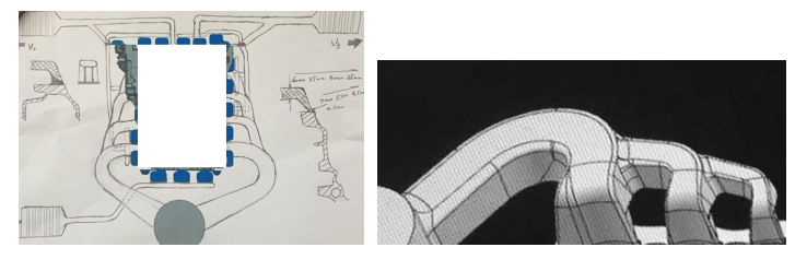 4.排氣及真空的設置: 1)排氣的設置:如前文所描述,雙側進料是鋁液從曲軸面往缸蓋面的單向填充,由于缸孔、水道、通風孔等的阻隔,雖然通過控制填充順序可以很大程度的優化排氣,但填充過程中在缸蓋面側仍會存在較為明顯的困氣情況,所以在設置真空排氣通道的時候需要覆蓋至少2/3的缸蓋面寬度,通過真空主動排氣將型腔中的氣體排出;