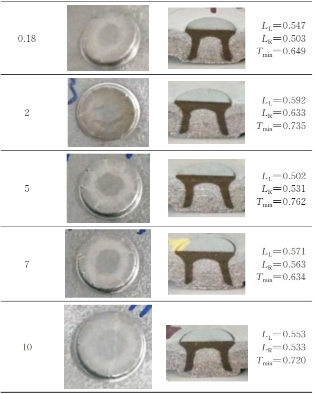 圖8 不同鉚釘長度的鉚接互鎖值 鉚接的工藝參數(鉚接速度、緩沖速度等)影響鉚釘刺入鋁合金本體的速度和鋁合金材料變形速率。采用G092095底模+廣新C5.3×5.5H2鉚釘,材料為5754鋁合金片材+AlSi10MnMg壓鑄件鋁片。改變鉚接速度、緩沖速度和保壓時間觀察底部裂紋的變化情況,見表3~表5。結果發現,鉚接速度為35 mm/s,保壓時間為0.3 s時,不同的緩沖速度下鉚接點的鉚扣上都有輕微裂紋,外觀上無明顯差異,鉚接的互鎖值和底部殘留量都符合要求且數據接近,可以推斷出緩沖速度對鉚接裂紋影響不大。不同的鉚接速度下,外觀上鉚扣表面都有細小裂紋,且相互間無明顯差異,各個鉚接速度下的互鎖值和底部殘留厚度合格,可以推斷出鉚接速度的變化對底模裂紋影響較小。不同保壓時間下,鉚扣底部都有微小裂紋,且相互間無明顯差異,鉚接的互鎖值和殘留底厚合格滿足標準要求,保壓時間對鉚接裂紋影響不大。 表3 緩沖速度對鉚接裂紋的影響