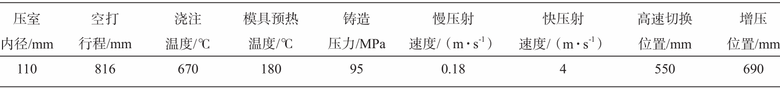 圖7 壓室充型模擬結果 依據模擬結果顯示,鋁合金液在壓室內溫度始終保持在液相線+30 ℃以上,且低速充型過程中,隨著沖頭向前推進,鋁液充型平穩,無卷氣現象產生,避免了壓室內氣體的卷入。 3.2 快壓射速度的選擇 快壓射速度選擇的原則:(1)鋁合金液在充滿型腔前必須具有良好的流動性,保證充型的順暢;(2)使鋁合金液能快速有序地充滿型腔,并把氣體排出到型腔外;(3)不形成高速的金屬流沖刷型腔或型芯,避免粘模現象的產生,鋁合金壓鑄件內澆道速度一般為40~60 m/s。油底殼鑄件內澆道總截面積為771mm²,壓室截面積為9498.5mm²,初步選定內澆道速度為50m/s ,依據伯努利方程:內澆道速度×內澆道截面積=高速速度×壓室截面積,計算得出高速速度為4m/s。 3.3 高速切換位置的選擇 壓鑄件理論高速切換位置為金屬液填充至內澆道位置,該油底殼鑄件理論高速位置為590 mm,但由于內澆道為上下排列,底部的內澆道會提早進料,導致鑄件底部位置出現冷隔問題,故將高速切換點設置為550 mm,具體壓鑄工藝參數見表1。