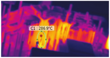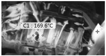 圖8 油底殼缺陷解剖圖 高壓油道孔泄漏問題為內部縮孔導致,部分泄漏產品縮孔外露導致裂紋產生,油道位置為產品熱節所在,油道鑄銷高壓點冷無法完全冷卻該位置,使用熱成像儀對該位置模具溫度進行檢測,油道鑄銷位置整體溫度近290 ℃,如圖9所示。通過調整鑄銷高壓點冷通水流量,延長通水時間,無明顯改善效果,初步判斷存在其他影響因素。通過反復確認CAE模擬結果,發現油道鑄銷正處于操作側末端兩股流道交匯處,如圖10所示,兩股流道直沖油道鑄銷且融合不良,從而導致鑄銷溫度過高產生縮孔甚至縮孔外露。