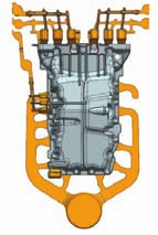 圖1 某汽車發動機油底殼結構示意圖 02 澆注方案設計 該零件壁厚最厚處高達18.5 mm,為高壓油道預鑄孔附近區域,見圖2。局部區域壁厚差異太大,形成熱節點,在鑄件凝固過程中由于補縮不足而產生縮孔、縮松缺陷,從而造成零件泄漏。針對此類缺陷問題,常見的解決方法是增設局部擠壓銷進行補縮,但該零件受限于產品及模具結構,無法有效設計擠壓銷,即擠壓銷油缸會與斜油道抽芯油缸產生干涉,高壓油道孔、斜油道抽芯孔位置見圖1(a)。因此,針對本油底殼高壓油道孔泄漏的風險,只能通過對壓鑄流道和高壓點冷方案設計來進行優化改善。