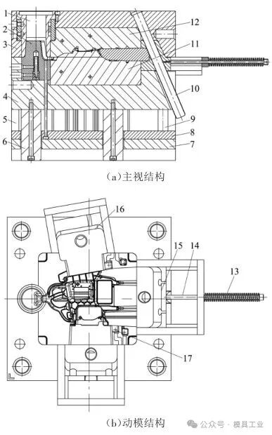 圖8 冷卻系統 3 模具設計 3.1 模具結構 模具結構如圖9所示,型腔板鑲件12通過螺釘固定在定模板3上,型芯鑲件11通過螺釘固定在動模板4上,導柱設計在定模板一側,便于開模后機械手取件,壓室1由雙層水路冷卻,分流錐2采用水井冷卻,水井底部用黃銅密封。模架由定模板3、動模板4、墊塊5構成,其中動、定模板須經過調質處理。型腔板鑲件主分型面與定模板平面平齊,型芯鑲件主分型面高出動模板平面0.15~0.2 mm,即設計合模間隙為0.15~0.2 mm,動模板對應溢流槽排氣位置開設深度為0.1 mm。為了防止模板變形,在分流錐2下方設置支撐柱,在模板中間也設置支撐柱,需避開頂桿孔位置。推板8采用4根復位桿9導向,墊塊5加工成整體式兼做底板用。動模板4個角設計30 mm×30 mm×8 mm撬模槽,在動、定模板上各設置4個大孔,方便拆裝型芯和型腔板鑲件。模板上吊模孔為M24 mm,其中天側為避開頂部滑塊拉桿須設置左右2個吊模孔。