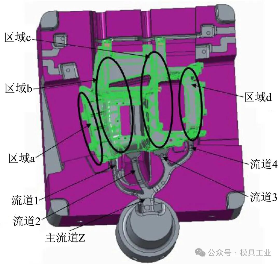 圖4 分型設計 澆注系統設計如圖5所示,主流道Z負責控制整個澆注系統的流量,其橫截面尺寸為25 mm×11 mm。遵循主流道橫截面大于分流道設計原則,即Z>1+2+3+4,其中分流道為1、2、3、4,分流道澆注系統中設置1、2、3、4流道分別對區域a、b、c、d進行充填。流道1為輔助流道:流道截面尺寸為7 mm×6 mm,內澆口截面尺寸為1.6 mm×8 mm,負責補充流道2因分型面爬坡的壓力損失。流道2為主流道,負責區域b的充填,流道截面尺寸為10 mm×8 mm,內澆口截面尺寸為1.2 mm×25 mm。流道3為次主流道,負責區域c的充填,流道截面尺寸為10 mm×8 mm,內澆口截面尺寸為1.2 mm×20 mm。流道4為輔助流道,負責區域d的充填,流道截面尺寸為8 mm×6 mm,內澆口截面尺寸為1.2 mm×9 mm。
