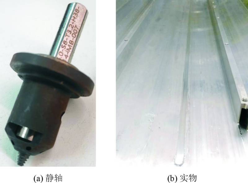 圖3 一體化電池托盤產品圖 目前攪拌摩擦焊焊具根據軸肩分類,可以分為動軸肩焊具和靜軸肩焊具。動軸肩在焊接過程中會隨著攪拌頭一起旋轉,這使得軸肩與被焊接材料之間產生相對運動,通過摩擦生熱來促進材料的軟化和流動,有助于形成良好的接頭。動軸肩能夠提供較大的摩擦熱輸入,有利于提高焊接效率和接頭質量。其可以使接頭金屬材料充分塑化,并且在攪拌作用下,材料的混合和均勻性較好,能夠減少接頭中的缺陷。圖4為動軸肩焊具和焊縫實物圖。 靜軸肩攪拌摩擦焊采用軸肩與攪拌針分體式設計,在焊接過程中內部攪拌針轉動,而外部軸肩不轉動,僅沿焊接方向行進。圖5為靜軸肩焊具和焊接實物圖。由于軸肩不轉動,表面熱輸入減小,工件厚度方向熱量分布相對較均勻;接頭摩擦熱量分布較為均勻,組織均勻性好,接頭表面光潔,飛邊量小。此外,靜軸肩能夠有效抑制接頭材料擠出,減少接頭減薄,可實現角接頭結構,降低孔洞、隧道等缺陷的形成幾率,接頭性能優良。
