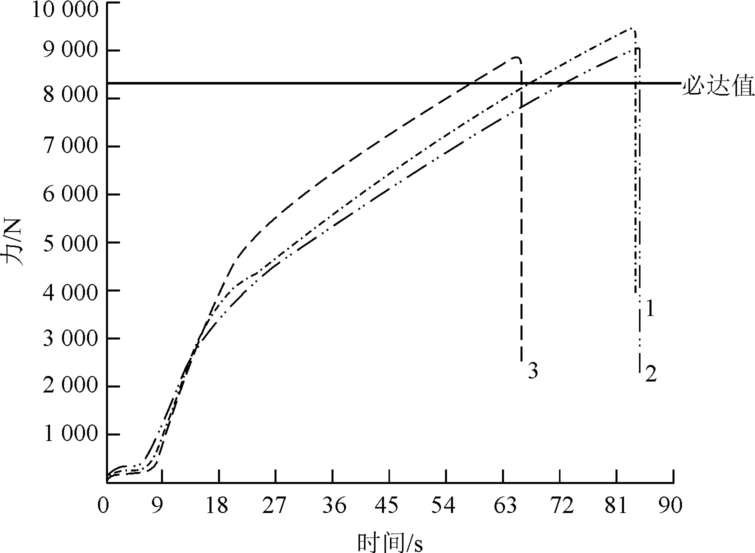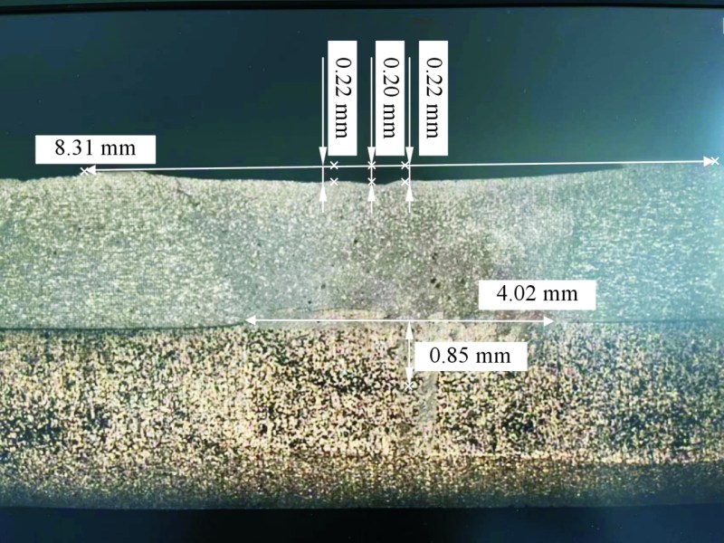 注:×表示金相或拉伸NG;—表示未做此組;○表示質量合格; 虛線框內為工藝窗口。 經過評估,選擇攪拌摩擦焊技術和鑄件本體復合水冷通道的設計,并采用雙機器人攪拌摩擦焊工作站和靜軸肩焊具的生產方案來制造超大型一體化電池托盤。 通過雙機器人攪拌摩擦焊技術成功制造出高質量的超大型一體化電池托盤。焊接接頭的外觀光滑、無明顯缺陷,內部無氣孔、裂紋等缺陷。圖7為攪拌摩擦焊斷面金相組織。攪拌摩擦焊后板減量要求≤0.4 mm,實測為0.22 mm,滿足要求(見圖7);力學性能要求為≥8 225 N,拉伸樣件平均測量值為9 130 N,圖8為攪拌摩擦焊拉伸力-時間圖??梢钥闯?,達到設計要求。