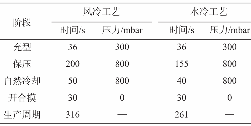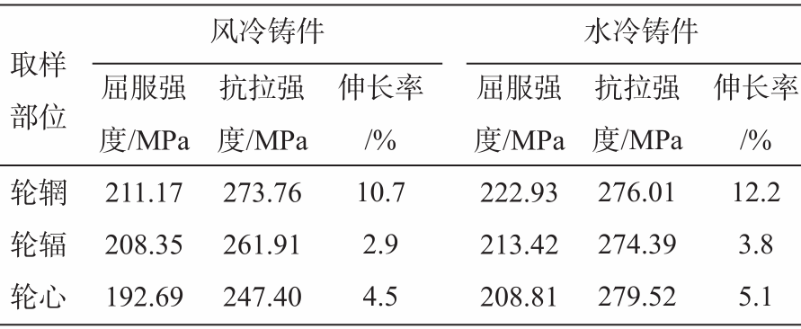 表1 風(fēng)冷和水冷生產(chǎn)工藝對比 經(jīng)對比發(fā)現(xiàn)該產(chǎn)品班產(chǎn)由原風(fēng)冷的91件(8 h)提升至110件(8 h),效率提升20.8%。且其力學(xué)性能也有大幅提升,見表2。