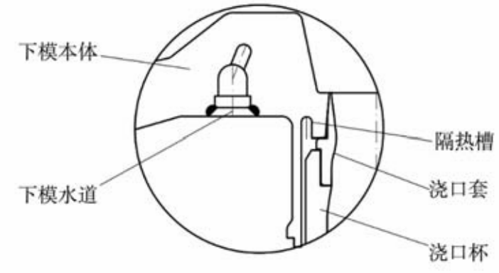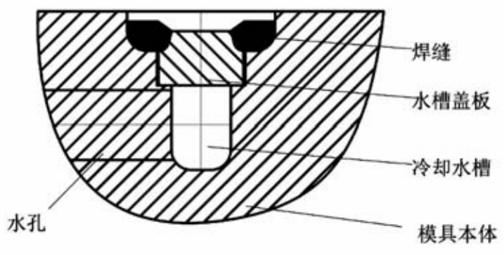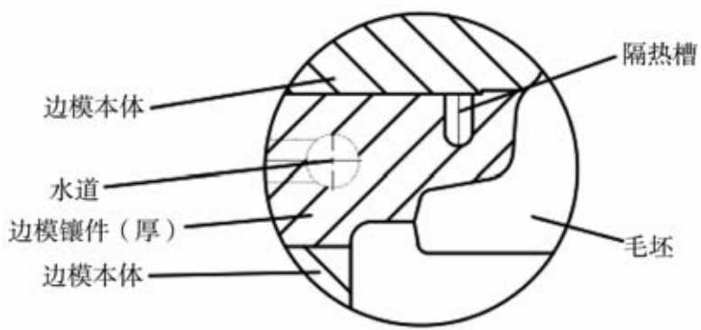 圖6 模具開裂 漏水的原因和對應(yīng)措施主要有:①材料內(nèi)部有缺陷,水道位置有渣孔、砂眼;措施:控制模具部件質(zhì)量和檢驗(yàn),防止原材料缺陷導(dǎo)致漏水;②壁厚太薄,在水的激冷作用下開裂;措施:水道在設(shè)計時一定要保證安全壁厚;③水槽蓋板和焊縫結(jié)構(gòu)不合理,達(dá)不到封閉效果;措施:設(shè)計時一定要保證足夠的封閉面和焊接面積,且焊縫不能高于工件表面以免碰傷;④焊接應(yīng)力導(dǎo)致工件過早開裂;措施:工件在焊接后要去除焊接應(yīng)力。開發(fā)新的水道加工方法,目前開始應(yīng)用放電打孔工藝,避免在模具上開槽,極大程度上解決了漏水問題,但只能用于非整圈結(jié)構(gòu)。 3.2 調(diào)節(jié)冷卻強(qiáng)度和范圍 直接冷卻強(qiáng)度速度快,激冷效果強(qiáng),影響范圍大,必須對冷卻范圍進(jìn)行調(diào)節(jié),否則工藝很難控制。一般調(diào)節(jié)措施為增加隔熱槽,將不希望受冷部位隔離開,部分隔熱見圖7、整圈隔熱見圖8。