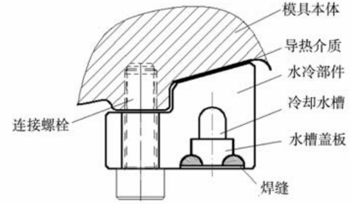 圖2 冷卻強(qiáng)度與流量關(guān)系 由于水冷結(jié)構(gòu)復(fù)雜,模具加工成本高,工藝不易控制,各公司都對其投入大量人力物力進(jìn)行研究開發(fā),目前雖還不能完全取代風(fēng)/水霧冷,但取得了一些進(jìn)展,在實(shí)際鑄造生產(chǎn)中得到一定的推廣使用。 02 水冷的方式及結(jié)構(gòu) 2.1 水冷的方式 由于水冷無法像風(fēng)/水霧冷那樣直接將冷卻空氣噴射在模具表面后散射到環(huán)境中,必須有回收管路,所以水冷的結(jié)構(gòu)較風(fēng)冷復(fù)雜。通常的結(jié)構(gòu)有兩種,即直接冷卻和間接冷卻。直接冷卻是直接在模具主件(上模、下模、邊模、中心)上加工水冷槽,開槽部位要保留安全壁厚避免開裂漏水(圖3);間接冷卻是制作水冷部件,貼緊在冷卻部位,并需要緊固,需要更大的空間;而且為達(dá)到更好地冷卻效果,需增加導(dǎo)熱介質(zhì)(圖4)。