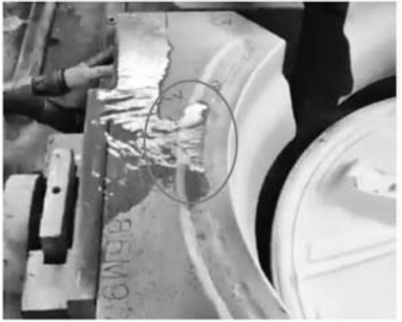 要保證水冷的效果一是要有足夠的壓力來保證流量,二是要根據(jù)環(huán)境溫度調(diào)節(jié)水溫。水冷管道在使用一定時間后會產(chǎn)生水垢,使管道內(nèi)管徑變小,水流量變小,降低冷卻效果,嚴(yán)重的會堵塞管道。經(jīng)過驗(yàn)證,定期使用酸液可以清除水垢,現(xiàn)在相應(yīng)的設(shè)備和工藝已經(jīng)很成熟。 3.1 開裂漏水 由于水冷激冷效果強(qiáng),水冷管道溫差變化大,在生產(chǎn)中極易發(fā)生開裂,尤其是在壁厚較薄和焊接部位,見圖6。目前水冷部件的壽命大概在20 000件,還不能達(dá)到模具本身的30 000件。