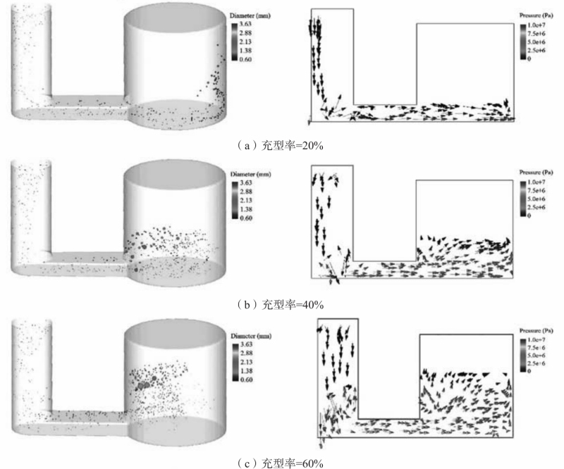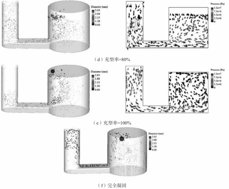 圖6 渣氣復合體粒徑分布和流場 圖6a、b為充型初始階段,外部引入的渣粒隨金屬液快速進入型腔中,此時在澆注系統中的渣粒體積變化不大,且呈彌散形分布,而在圓柱試樣上層液面區域開始出現粒子的聚合長大。其原因是由于直澆道和橫澆道區域的流速較大,渣粒之間的聚合長大不明顯。而在試樣上部液面區域的流速顯著降低,使得渣粒之間的碰撞聚合長大較為明顯。由于充型初期金屬液溫度變化不大,在此期間氫氣在渣粒表面的吸附量也較小,在這個階段中渣氣復合體的體積變化主要是以渣粒間的聚合長大為主。圖6c-e為充型中后期階段,直澆道與橫澆道內的流速有所減緩,可以看到因渣氣復合而形成的粒子體積增加。同時內澆口區域的流速顯著降低,這使得該區域開始出現渣氣復合體的快速聚合長大(圖6e)。在此期間,渣氣復合體不斷向上方運動,其聚合體積進一步加大,從而在試樣頂部可以看到有較多大體積的渣氣復合體的存在。圖6f表示完全凝固后渣氣孔的分布,從圖中可以看到,直澆道和橫澆道內的渣氣復合體體積有了明顯的增加。同時,試樣頂部的渣氣孔分布也較為明顯,且體積較大,而試樣中下部區域的渣氣孔數量較少,且體積較小。其原因是由于在凝固階段金屬液溫度不斷降低,促使熔體中的氫大量析出并吸附于渣粒表面,渣氣復合體中氫氣含量的不斷上升使得其密度減小,促進了渣氣復合體向試樣上部的移動。與試驗結果對比,模型計算所獲得的渣氣孔分布規律及形貌特征與實際基本吻合。 2.4 夾渣對渣氣孔形成的影響 為了研究外來夾雜的引入對鑄件中渣氣孔形成和分布的影響,采用相同的工藝條件分別計算了無夾渣和有夾渣進入的條件下鑄件內氣孔和渣氣孔的分布,結果如圖7所示。