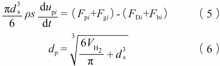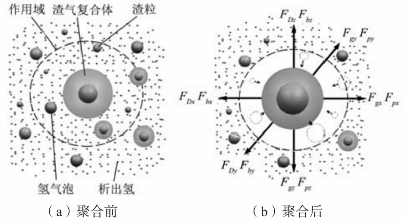 圖2 渣氣聚合長大原理圖 在每一個時間步中,處于復合體作用域內的氫氣泡、析出氫、渣粒及渣氣復合體之間將觸發聚合運算,且遵循大粒子吞并小粒子、復合體吞并渣粒和氣泡的規則,最終形成一個體積更大的渣氣復合體,同時每個復合體的作用域大小隨復合體的直徑及渣氣比等動態變化。基于復合體的受力分析,復合體的運動控制方程如下: