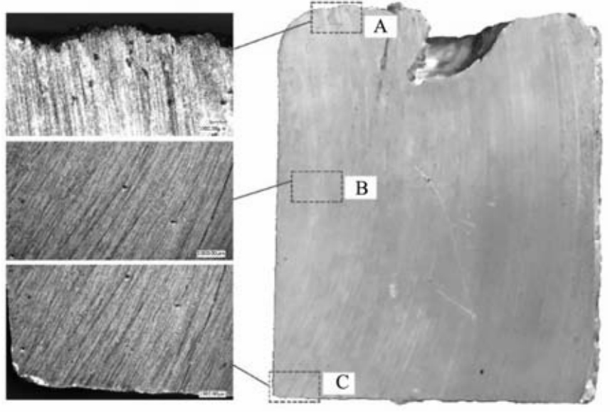 圖3 試樣模型及尺寸圖 2.2 渣氣孔的分布與三維形貌 圖4 為圓柱試樣縱截面照片,對試樣的頂部(A)、中部(B)和底部(C)區域進行渣氣孔分布分析。