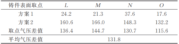 在采用冷卻效果比較好且能解決連接濾清器位置局部燒傷缺陷的金屬3D打印隨形冷卻鑲件的方案基礎上,在Magma模擬軟件中增加兩個邊界條件,即抽真空與常規大氣排氣,再通過模擬結果對比來驗證抽真空工藝與常規大氣排氣對濾清器安裝面氣孔的影響,從而得出優化解決兩個缺陷的組合方案。 從模擬結果分析,根據鑄件的填充氣壓對比,通過對濾清器安裝面的取點測量可知使用方案3抽真空工藝比使用方案4大氣排氣的氣壓數值低,氣壓數值平均低約131.8 kPa,因高氣壓引起的氣孔外露風險降低。圖8為兩個方案的氣壓模擬對比圖,表4為兩個方案的取點氣壓對比數據表。方案3為抽真空排氣模擬,方案4為常規大氣排氣模擬。
