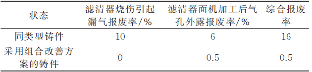 綜上,通過Magma軟件的模擬結果對比可知,采用高真空工藝比采用常規大氣排氣工藝時濾清器安裝面的氣壓數值低,對改善氣孔缺陷效果明顯。同時,采用金屬3D打印隨形冷卻鑲件和抽真空工藝結合是解決鑄件連接濾清器局部燒傷及濾清器連接面機加工后出現氣孔外露缺陷的理想組合方案。 在壓鑄生產過程中,針對鑄件連接濾清器的成形位置,決定采用高碳高合金鋼W360為金屬3D打印隨形冷卻鑲件代替傳統的8418材料的直冷鑲件,冷卻效果得到很好的改善,使用壽命也比傳統的8418材料長。為提高模具抽氣效果,增強模具的密封性能,在定模模芯與模架分型處開一條密封槽,并在密封槽內加裝耐高溫密封圈;動模墊板后面增設一塊可固定在動模墊板上的密封板,并在密封板上開設了密封槽及緩沖氣槽。 使用3D金屬打印技術制造的隨形冷卻的鑲件與抽真空工藝結合進行壓鑄試制,該鑄件連接濾清器的部位的角位燒傷引起的漏氣報廢率跟同類型鑄件相比由原來的10%變為0%,加工面氣孔外露的報廢率跟同類型鑄件相比由原來的6%變為0.5%,綜合報廢率跟同類型鑄件相比由原來的16%變為0.5%,完全符合客戶的使用要求。表5為報廢率對比,圖9為連接濾清器位置實物圖。 表5 報廢率對比