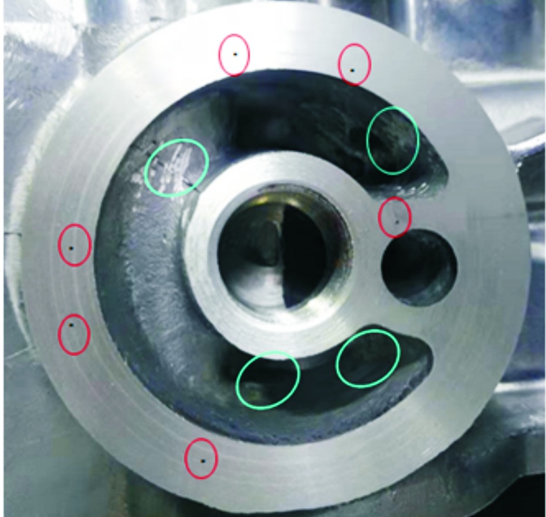 圖1 鋁合金曲軸箱壓鑄方案示意圖 圖2為鑄件連接濾清器局部位置圖。根據初步分析,該鑄件連接濾清器的部位結構較復雜,紅色區域(基于原圖為彩色描述,下同)較深且狹小(深26 mm,寬7 mm)。該位置的模具鑲件用傳統技術加工出來的冷卻水道不能深入底部并環繞一周,冷卻效果差,造成紅圈區域燒傷嚴重并且漏氣。同類型鑄件不僅在該位置的燒傷比較嚴重,而且有機加工后出現氣孔外露的現象。圖3為同類型鑄件的缺陷圖所示,紅圈為氣孔缺陷,藍圈為燒傷缺陷。因此如何提高該區域的冷卻效率及減少氣孔是整個壓鑄工藝設計的難點。